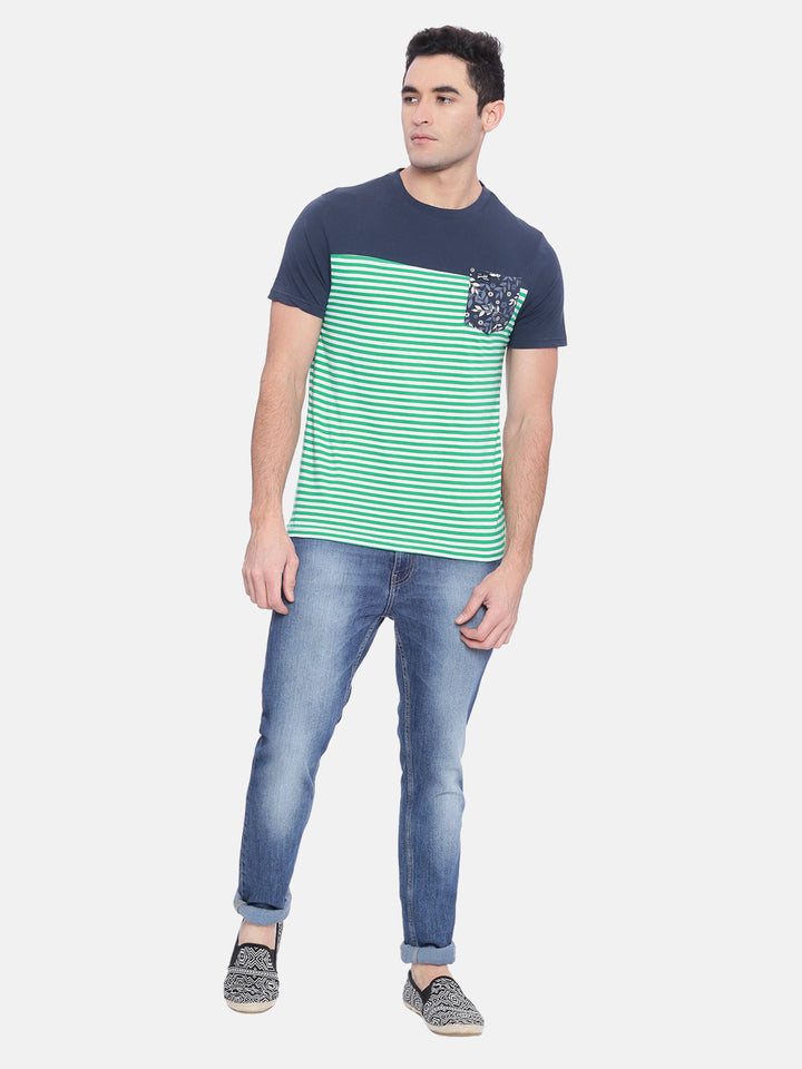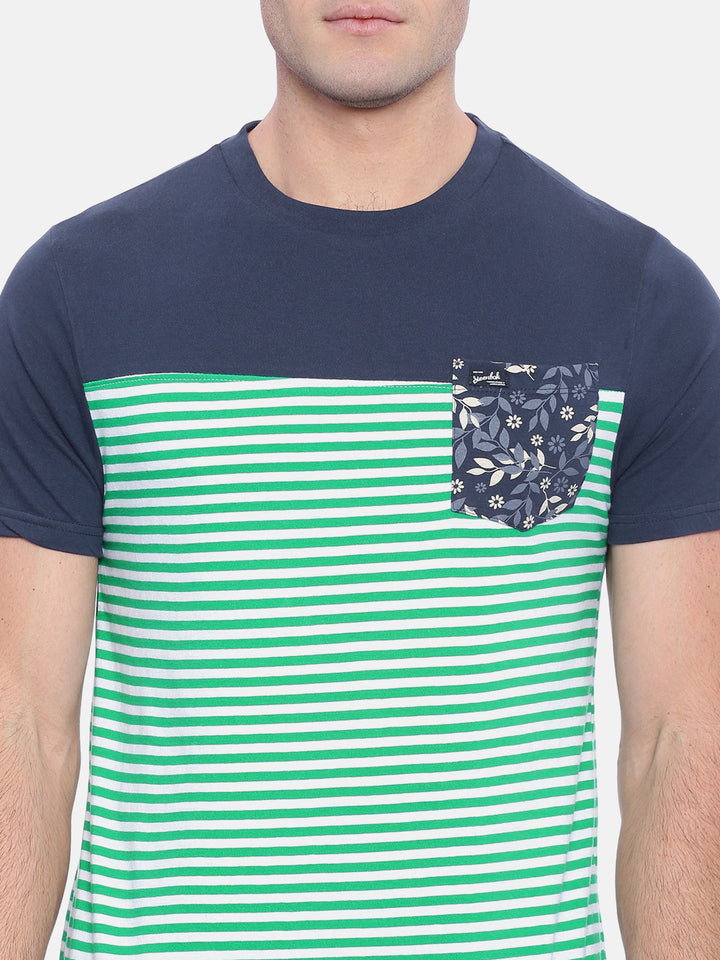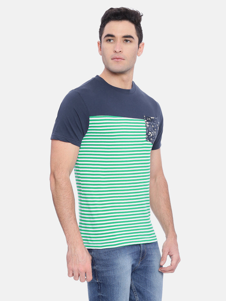Green and navy blue striped T-shirt, has a round neck, short sleeves, one pocket