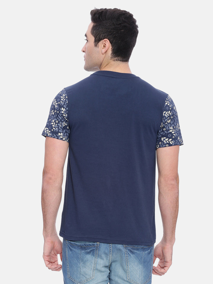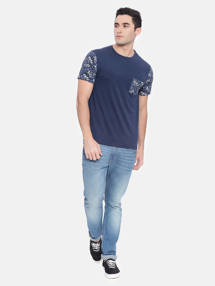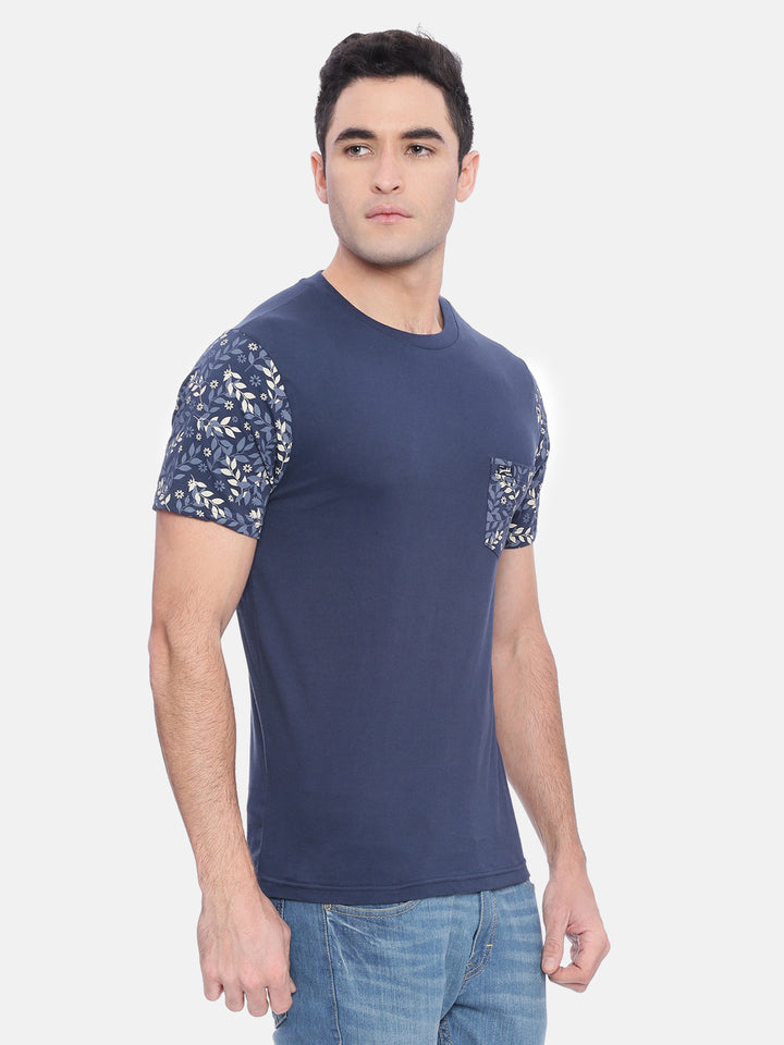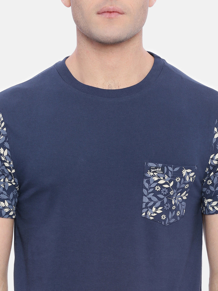 Navy printed T-shirt, has a round neck, short sleeves, one pocket
